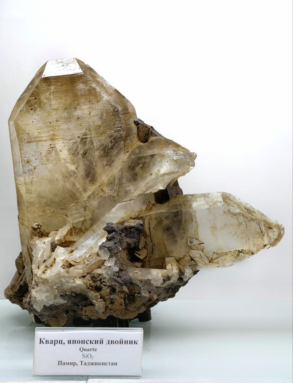 Еще один уникальный минералогический образец – гигантский японский двойник кварца – горного хрусталя с Памира (Таджикистан). Термин «японский двойник» впервые отмечен для геометрически закономерных сростков кварца в начале 20-го века. Название было дано по внешнему сходству с бантом на женском национальном японском платье, а также в связи с широким распространением двойников этого типа на двух местонахождениях в Японии. Японские двойники кварца в природе встречаются крайне редко, и они, как правило, не крупного размера. Представленный же в нашей музейной экспозиции является одним из крупнейших в мире.