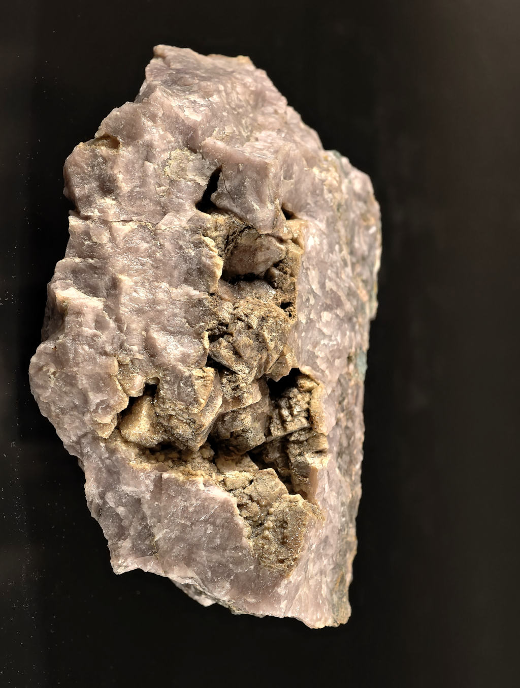 Светло-сиреневый образец уссингита из знаменитой жилы «Шкатулка» - уникального минералогического объекта, вскрытом горными работами Умбозерского лопаритового рудника в Ловозерском массиве в начале 90-х годов 20 века. Сам по себе уссингит – является крайне редким минералом, и все его находки связаны c редчайшими ультаагпаитовыми пегматитами массивов щелочных пород. Находки же кристаллов уссингита уникальны. Здесь же вы можете видеть целую минерализованную полость, инкрустированную несколькими крупными кристаллами уссингита, частично покрытыми тонкой корочкой коричневого неотокита. Находка была сделана сотрудниками музея во время работ по изучению минералогии жилы «Шкатулка».