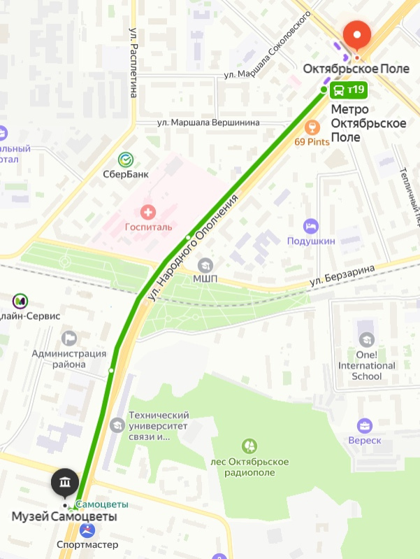 1 выход, пройти к автобусной остановке "Метро Октябрьское Поле". Автобусы, следующие до остановки у музея - 291, 300, 800, Т61, Т59к, Т19. Выходить на остановке "Улица Маршала Тухачевского"