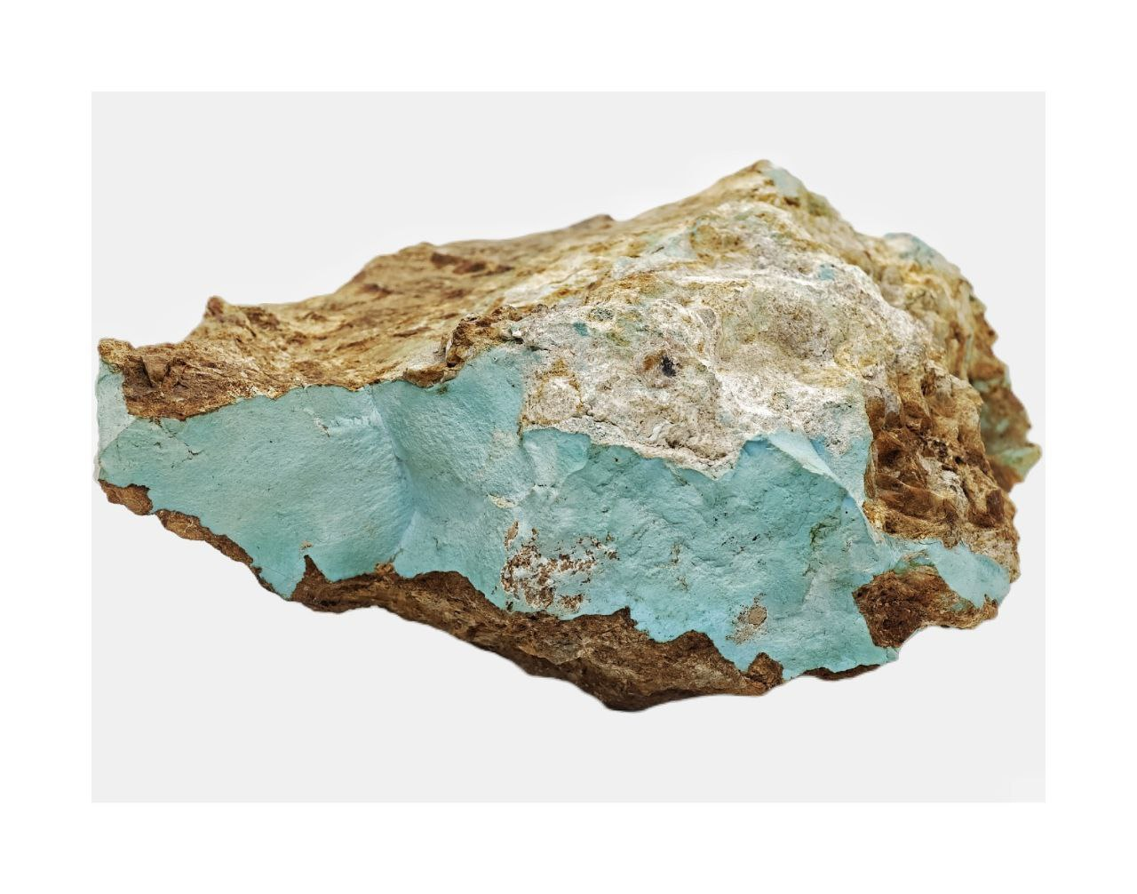 Массивный прожилок голубой бирюзы из Таджикистана. Бирюза – водный фосфат меди и алюминия – очень капризный ювелирный камень. Она часто неустойчива и со временем теряет свой цвет. Ювелирные характеристики бирюзы зависят от плотности камня и включений других минералов. Представленный в музее прожилок бирюзы за многие десятилетия не изменился в цвете. Он плотный и без включений других минералов в своей массе, что делает эту бирюзу одной из лучших по качеству в мире.